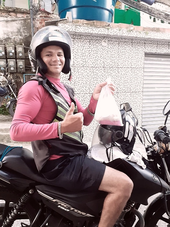 “Ieri il nostro amico Giulio ci ha donato confezioni da hotel di shampoo e tantissime saponette. Le ha ritirate uno dei motoboy qua del punto della rua Dioneia, Felipe. Te lo ricordi? Prima lavorava con João nel suo barettino. Abbiamo fatto tanti sacchettini, che sono stati distribuiti ai motoboy . Dovevi vedere come era felice.”